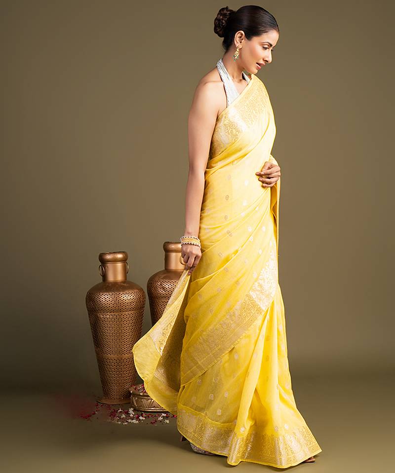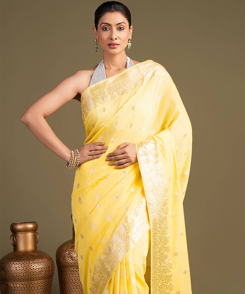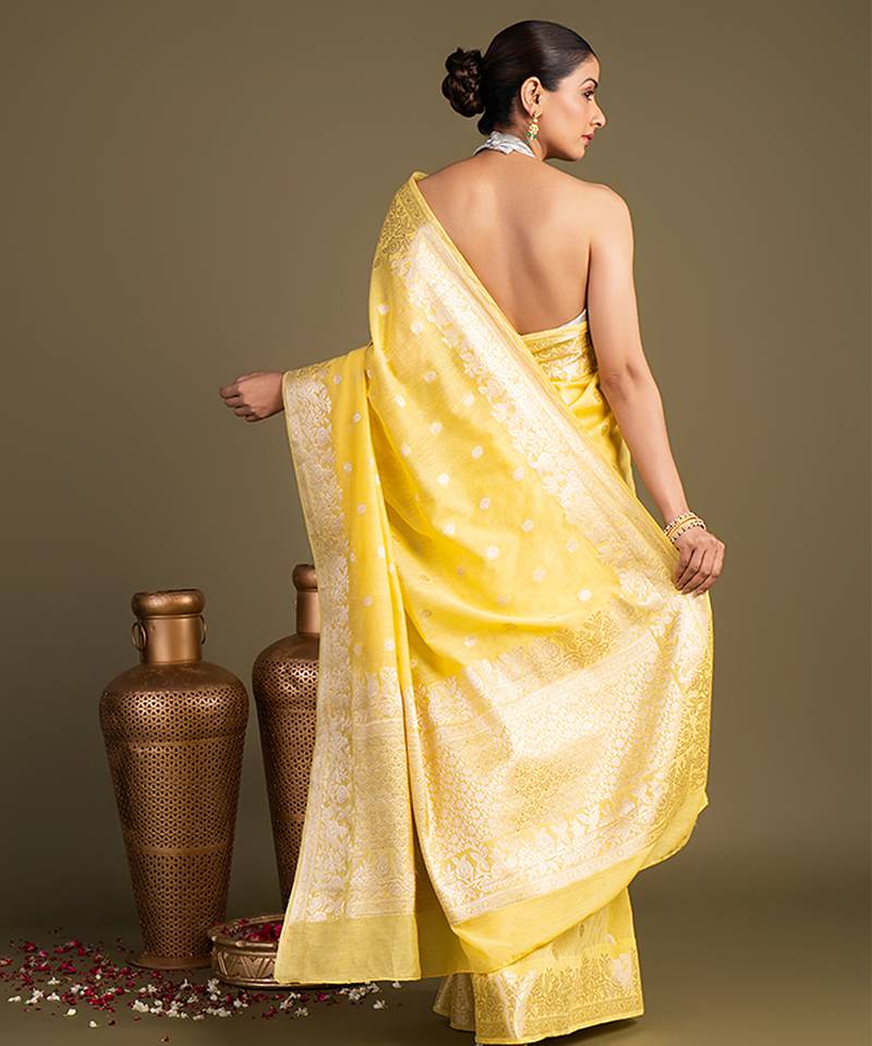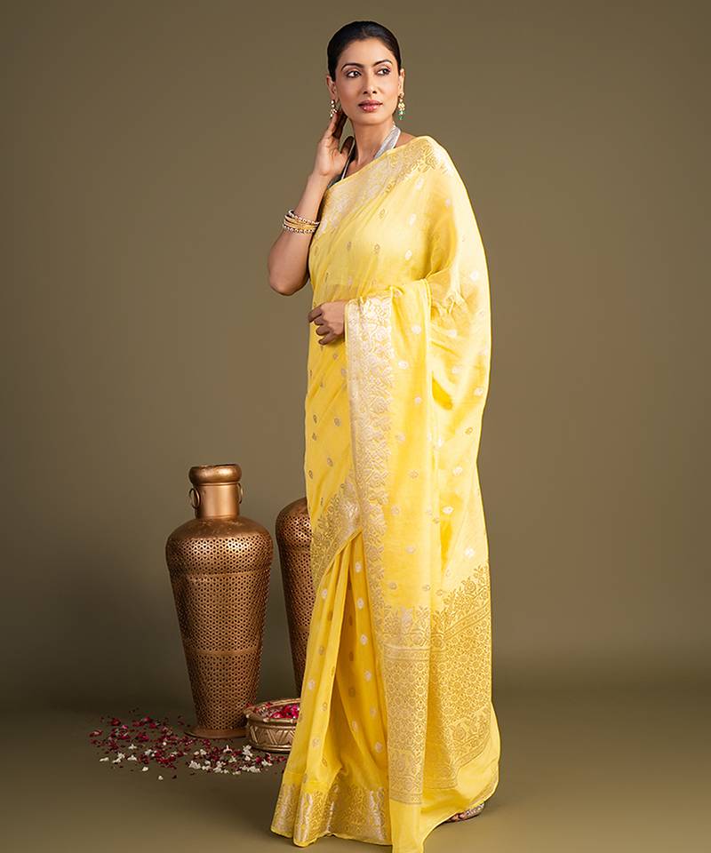 | Product Description | This Yellow Banarasi Silk Saree Showcases Intricate Handwoven Motifs That Enhance Its Vibrant Appeal. Crafted With Precision, It Offers A Rich Texture And Elegant Drape. Perfect For Festive Occasions, It Pairs Beautifully With Traditional Jewelry For A Radiant And Timeless Look.